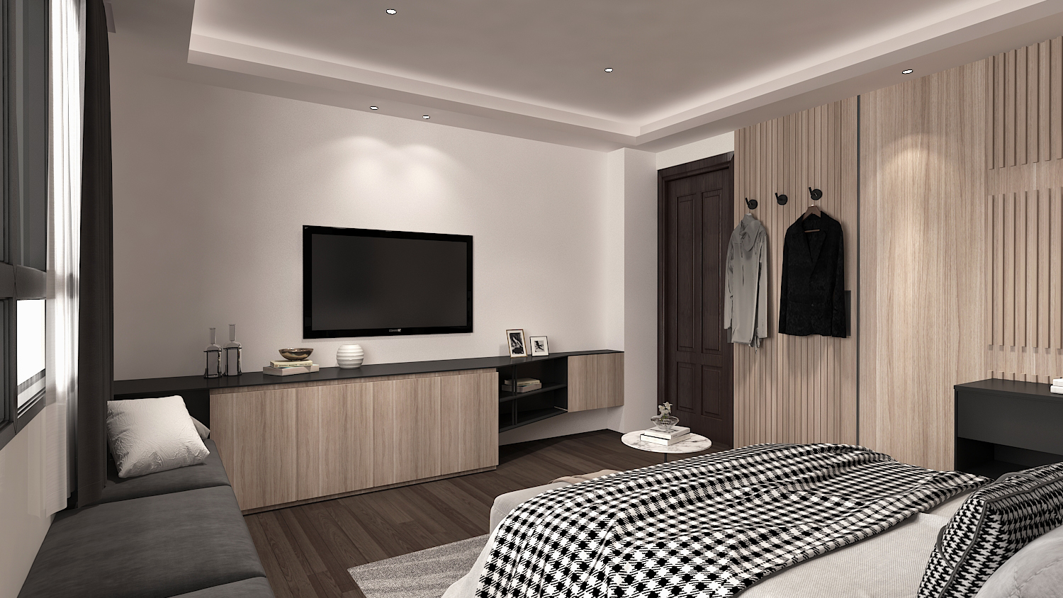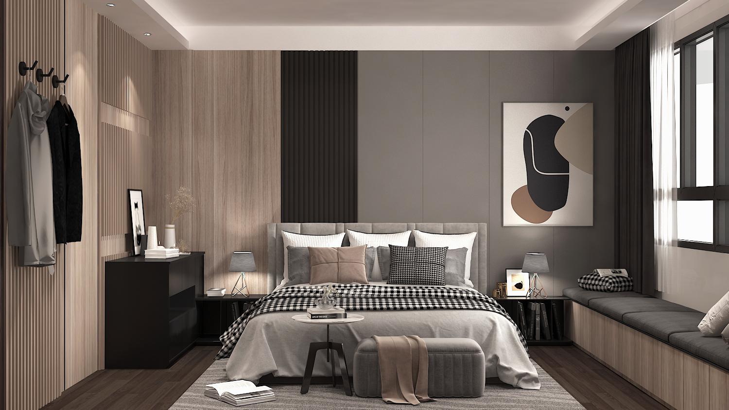 主臥區域以大量的木質暖調輔以格柵造型,提升視覺上的變化。