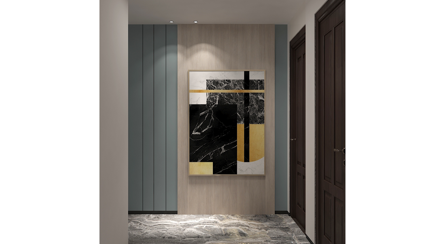 樓梯的轉角空間則利用凸於牆面的木作與霧霾藍色的漆面呈現多層次外,讓沉穩的空間裡多了一份活力。