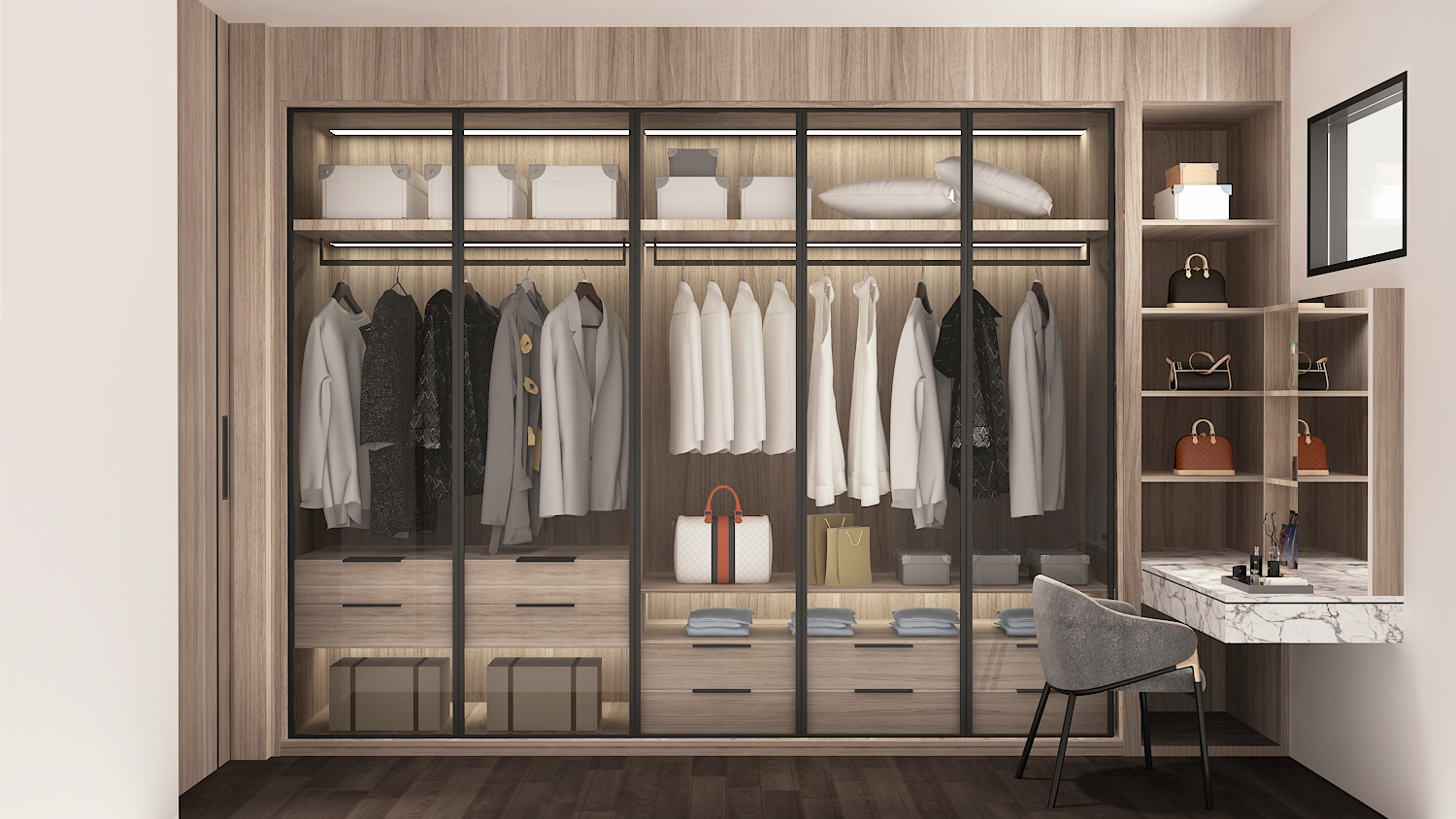 整體以女主喜好的灰調為基底,加上材質本身的色澤帶出空間的個性。