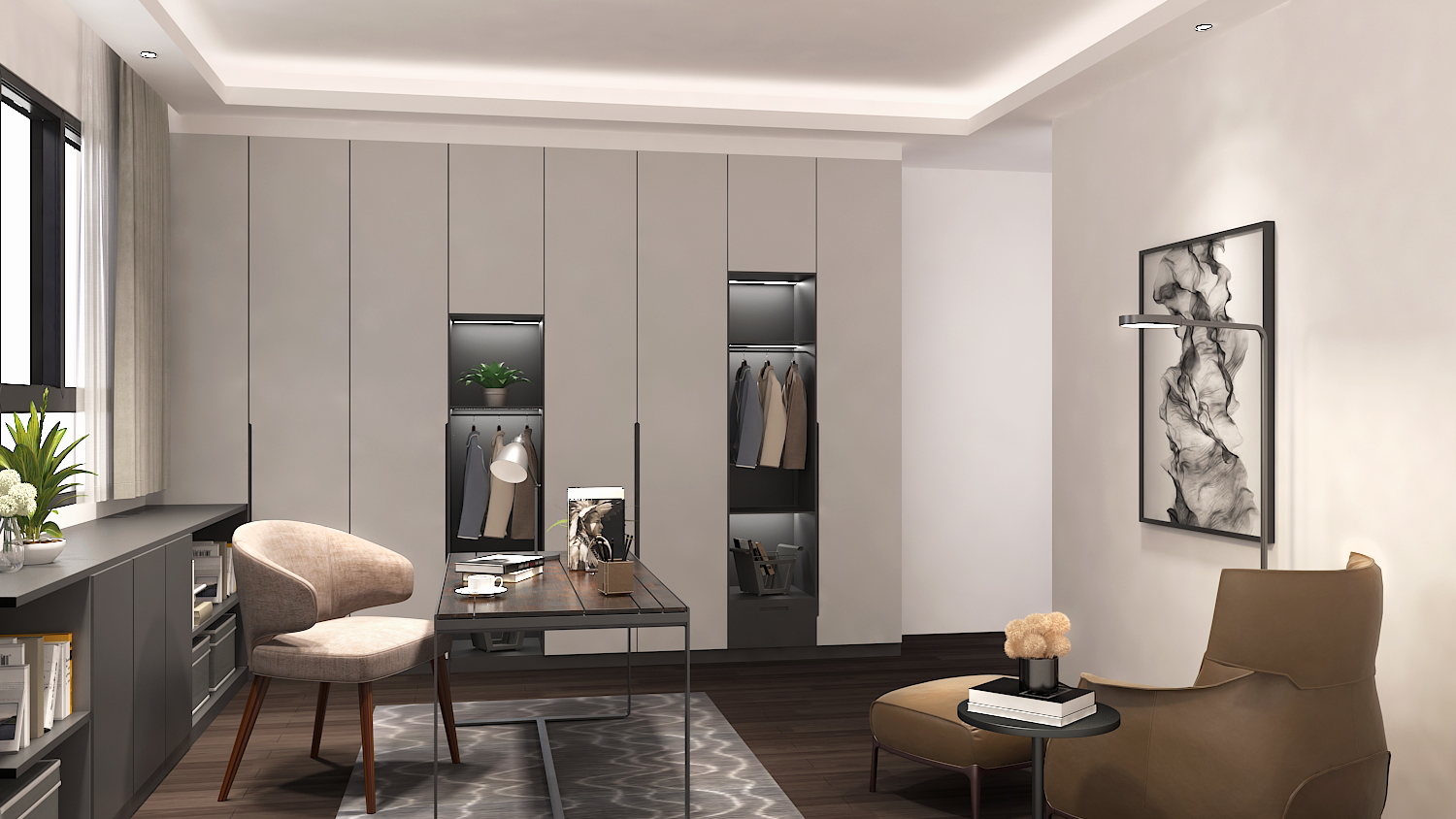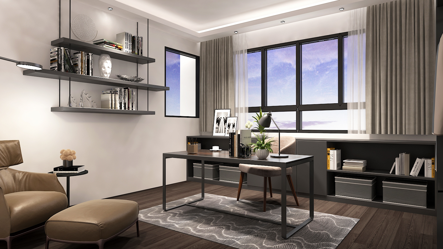 書房空間以屋主喜好的沉穩調規劃,扁鐵烤漆矮櫃與牆面厚實線條的層板,使空間同時展現粗曠與細膩。